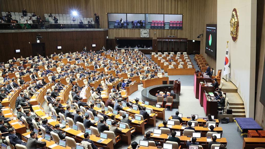 当地时间2024年12月12日,韩国首尔,韩国国会举行议员总会,通过“尹锡悦内乱普通特检法”。视觉中国 图